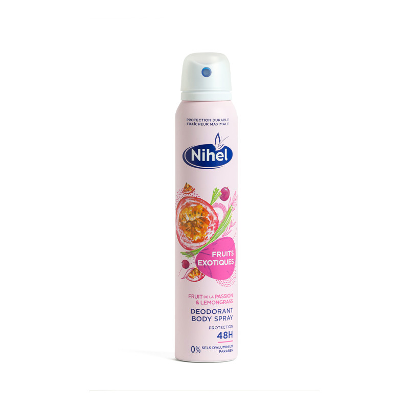 Le déodorant spray FRUITS EXOTIQUES pour femme au parfum Fruit de la Passion et Citronnelle permet de garder vos aisselles fraîches et propres et vous offre une agréable sensation de fraîcheur tout au long de la journée en assurant une protection longue durée ! Sa formule sans sels d'aluminium contient un agent antibactérien naturel qui régule la croissance des micro-organismes responsables des mauvaises odeurs tout en respectant l'équilibre naturel de votre peau. Son délicieux parfum aux notes tropicales de Fruit de la Passion et de Citronnelle transporte votre esprit dans un paradis tropical.