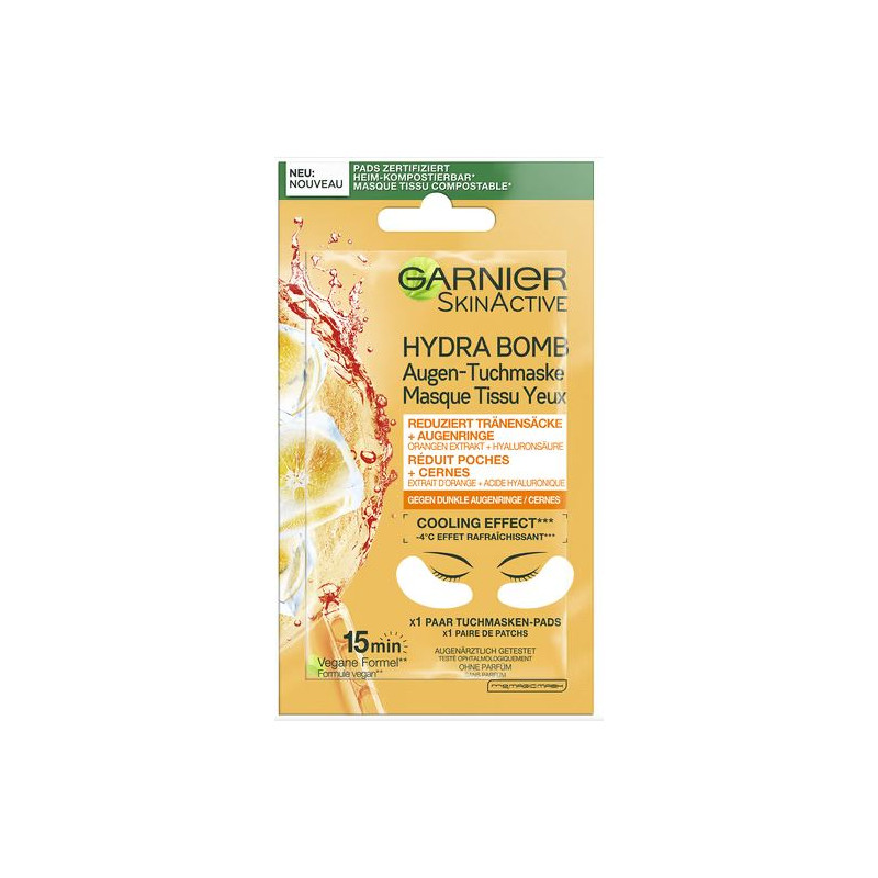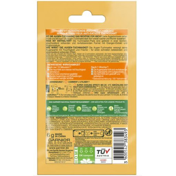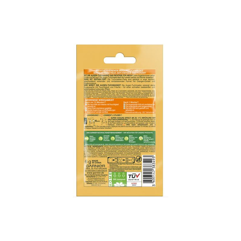 Le Masque Tissu Yeux Anti-Fatigue Énergisant de Garnier à l'extrait d'Orange + Acide Hyaluronique agit contre les poches et les cernes en 15 minutes seulement. La formule, enrichie en extrait d'orange et acide hyaluronique, hydrate intensément et procure un effet rafraîchissant sur le contour de l'œil. Parce que Garnier est engagé dans la préservation de l'environnement, nous avons créé un masque tissu compostable domestique. Si vous n'avez pas de compost domestique, jetez votre masque dans son emballage dans la poubelle de déchets ménagers.