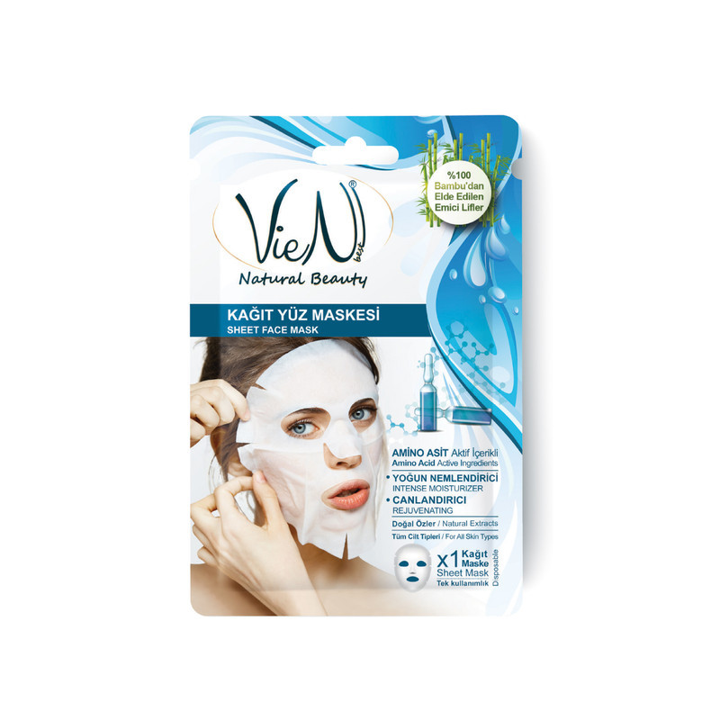 Masque visage en papier VieN aux acides aminés, pour une hydratation intense, une régénération des tissus et une peau revitalisée.